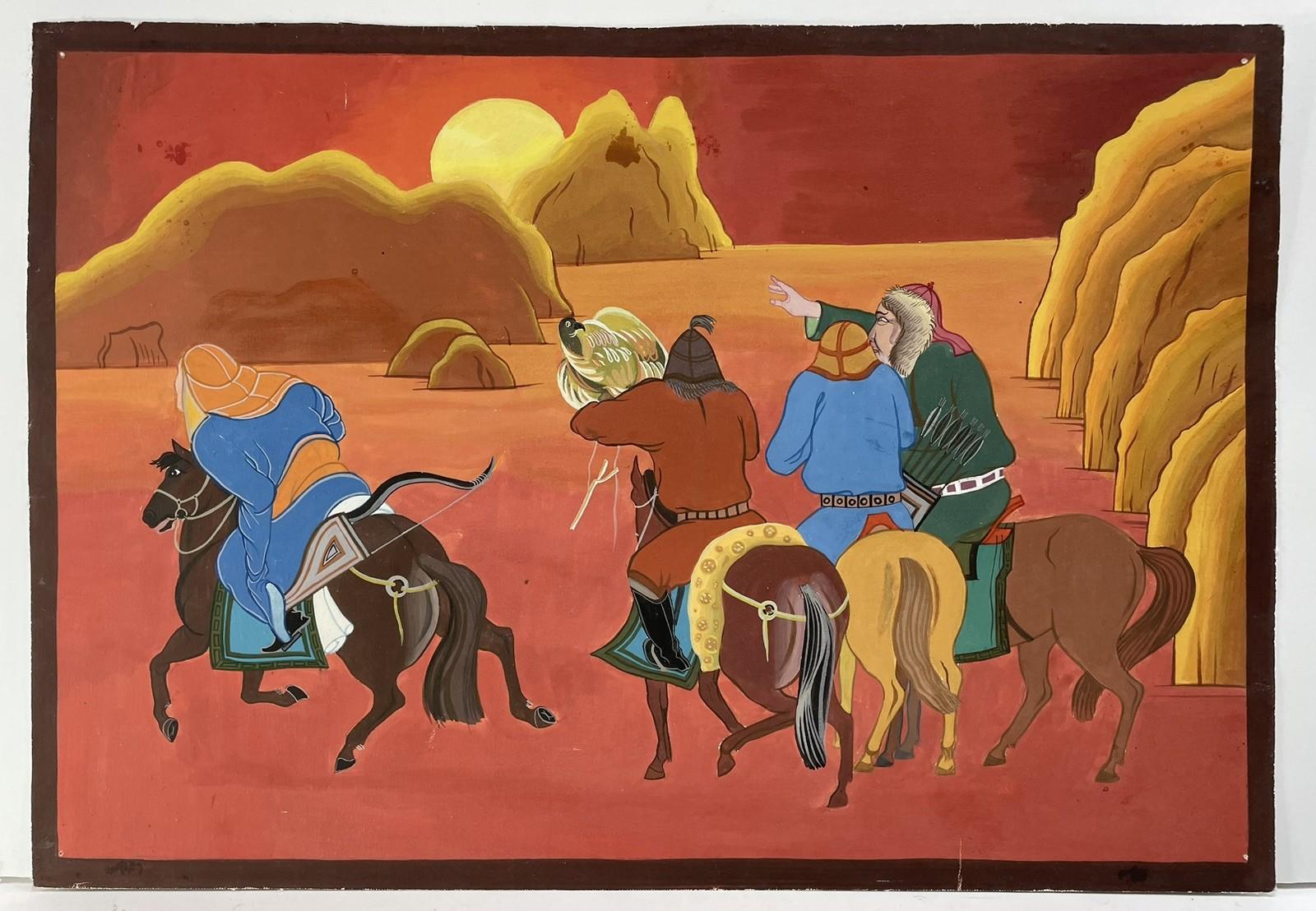 Antique Mongolian Landscape Hunting Falconry Horse ZURAG Gouache Painting