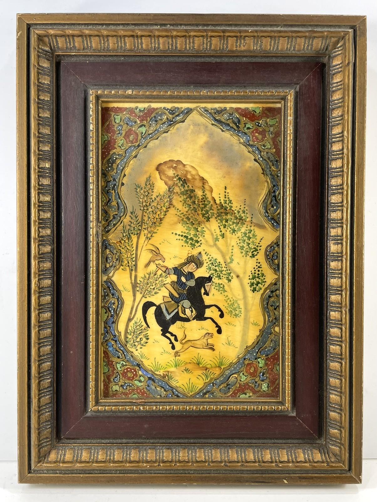Antique Persian Miniature Oil Painting Celluloid Horse Falcon Dog Hunting FRAMED