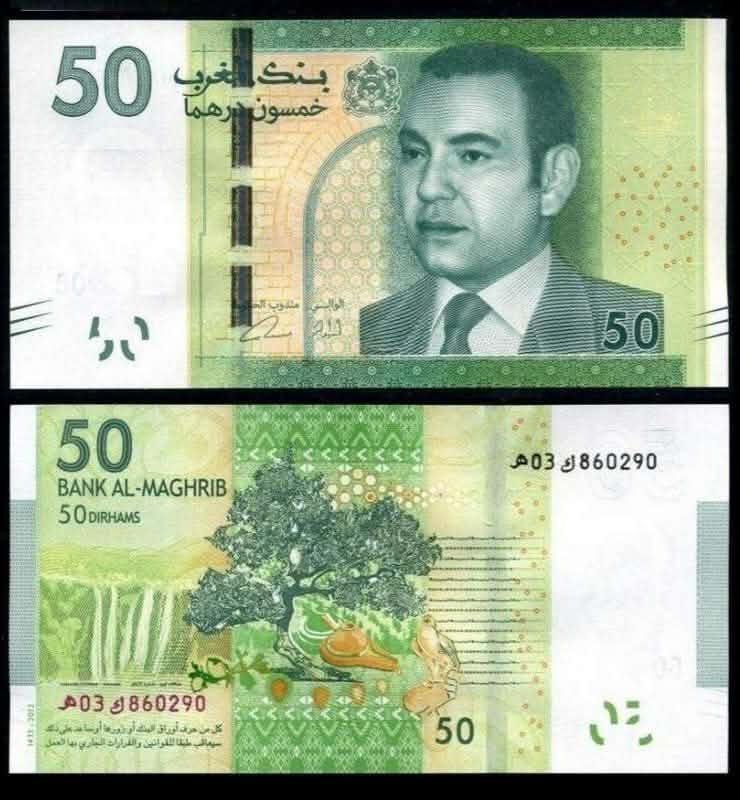 Banknote - 50 Moroccan dirhams (about 5 euro) of Al-Meghrib Bank with a falcon on back side