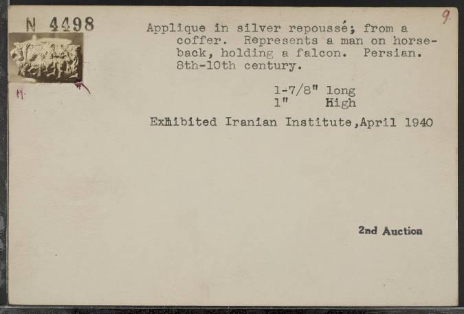 4498 : 8th-10th C. Persian applique in silver repousse; form a coffer representing a man on horseback holding a falcon.