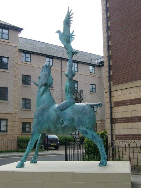 Horse-rider-eagle 1997 Sculptor Eoghan Bridge in Silvermills, Scotland, UK