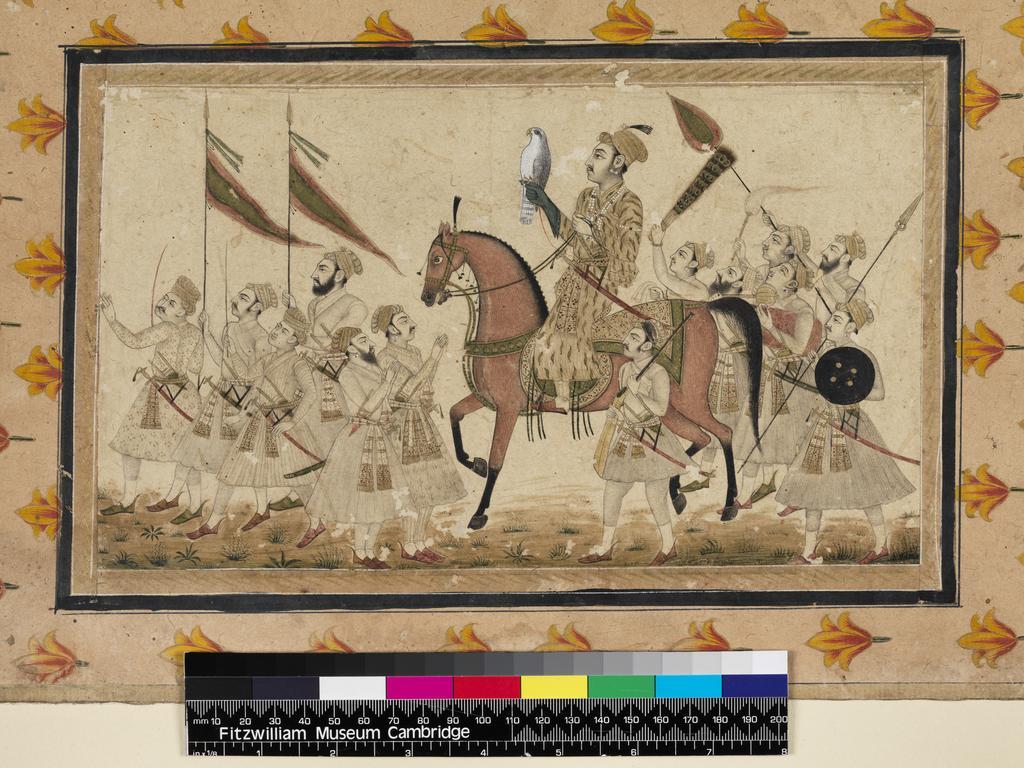 Mogul prince riding out hunting, a falcon on his right hand, with numerous attendants on foot: PD.98-1948