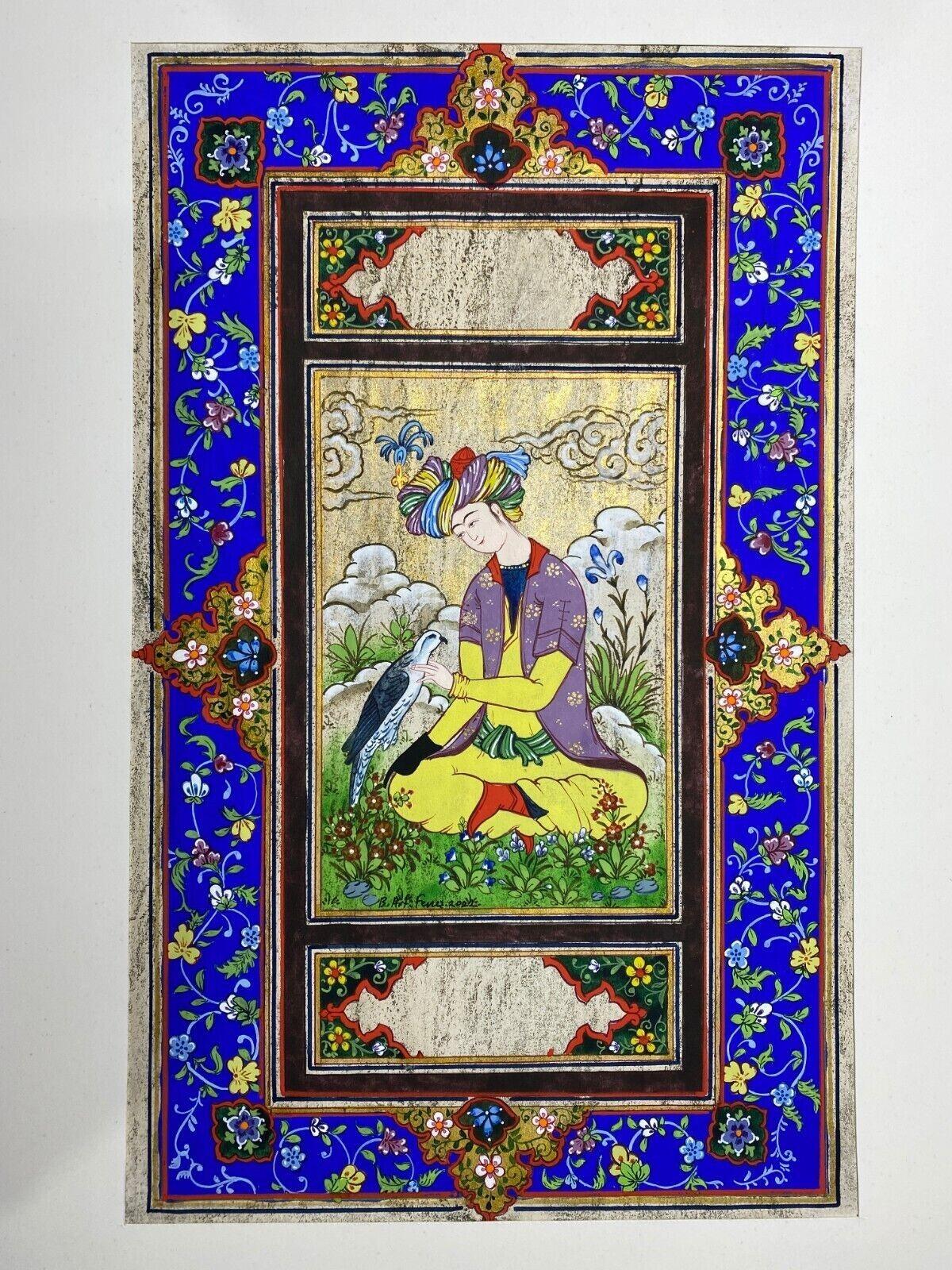 Miniature Painting Persian Art Work Silk Paper Handmade Youth & Falcon 11.4 x 7"
