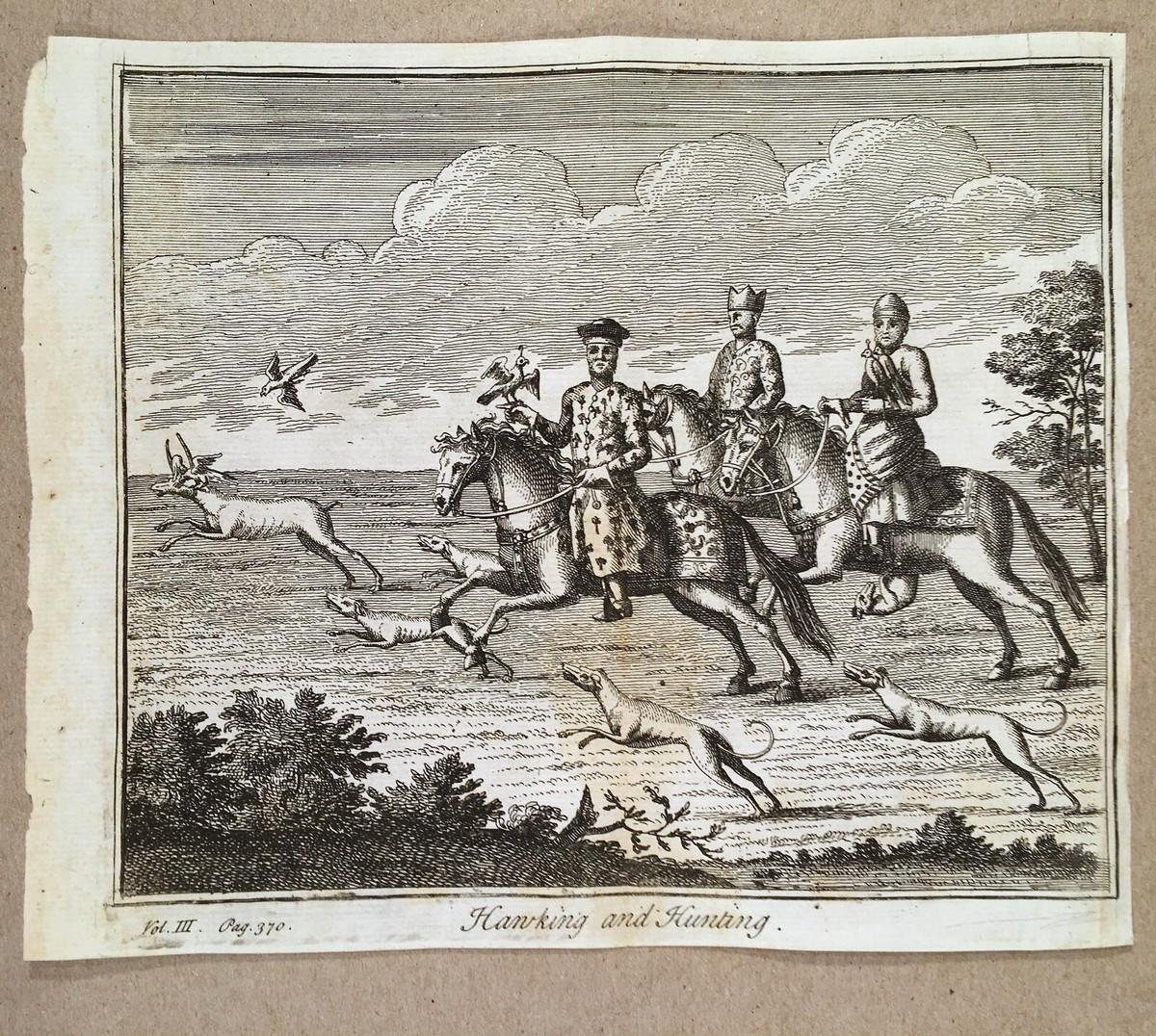 Original 1725-28 Thomas Salmon's Engraved Scene of HAWKING AND HUNTING IN PERSIA