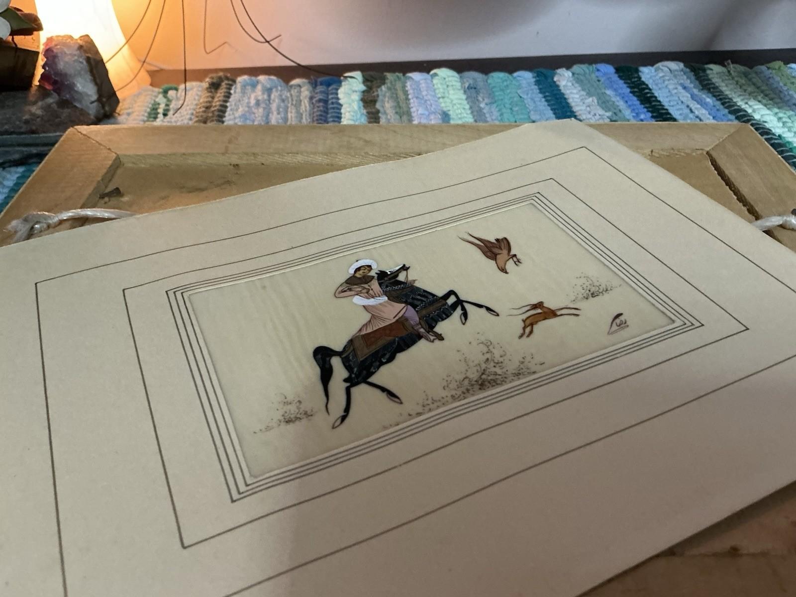 PERSIAN Bone MIDDLE EASTERN Warrior PAINTING Artist Signed Hunter FALCON Horse