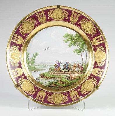 Plate with Russian falconer by M.S.Kuznetsov porcelain factory