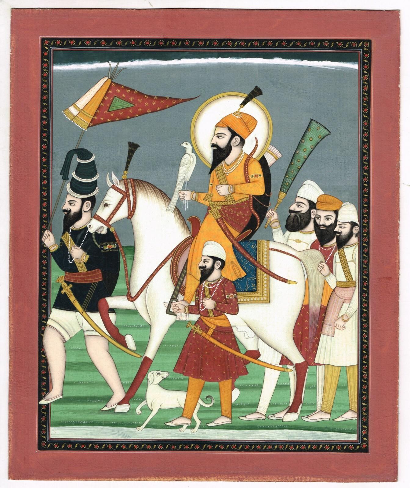 Sikh Miniature Painting Of Guru Gobind Singh On Horse With Falcon 9.5x11.5 Inch