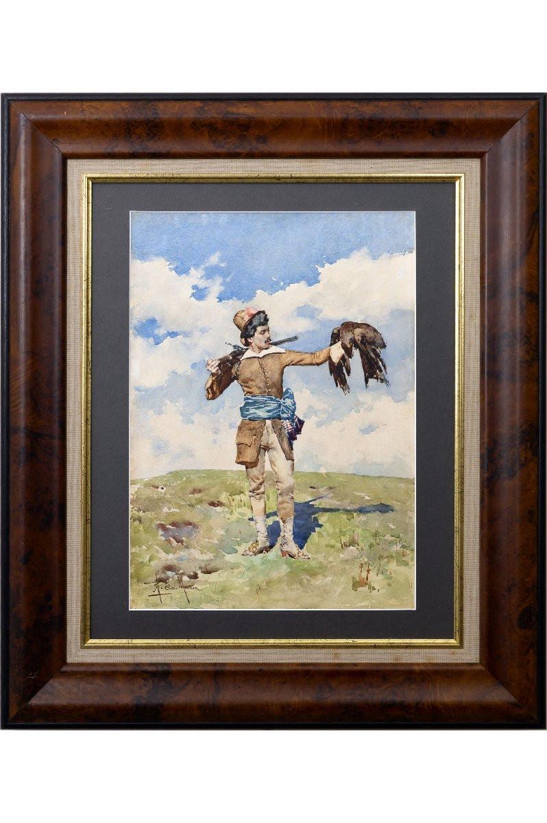 Alberto La Monaca – Falconer – Watercolor – 19th Century - Signed
