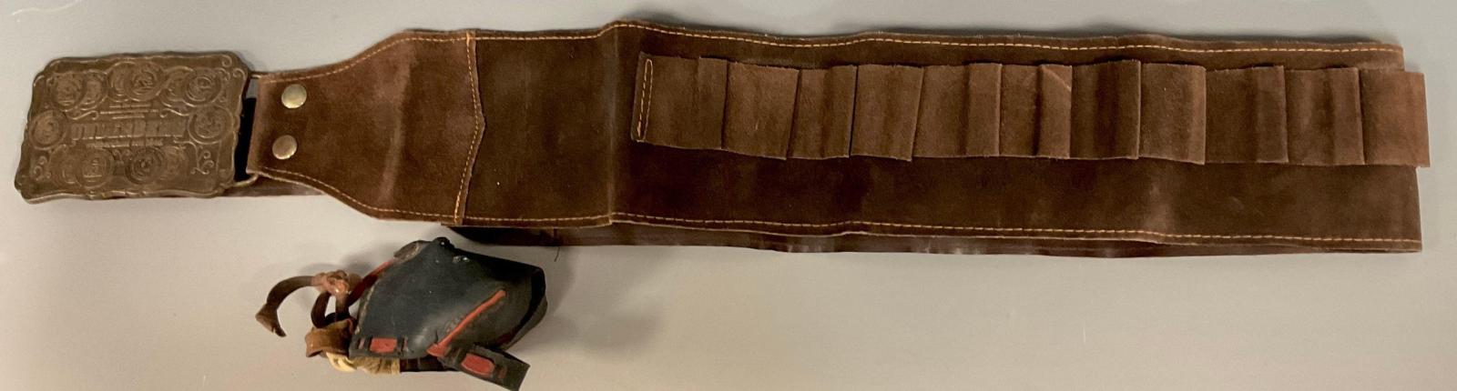 An Underberg leather shotgun cartridge belt, 20 shot capacity, metal buckle 111cm long; A Falconry Hood (2)