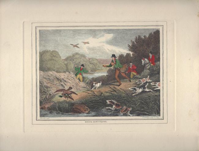 ANTIQUE HAND COLORED AQUATINT,PLATE ENGRAVING,SAMUEL HOWITT,DUCK HAWKING,1799