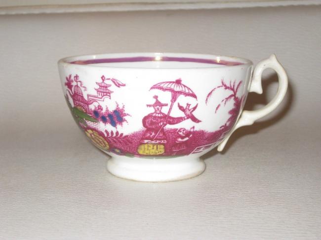Antique Sunderland luster Tea Cup chinoiserie Figures with falconry bird