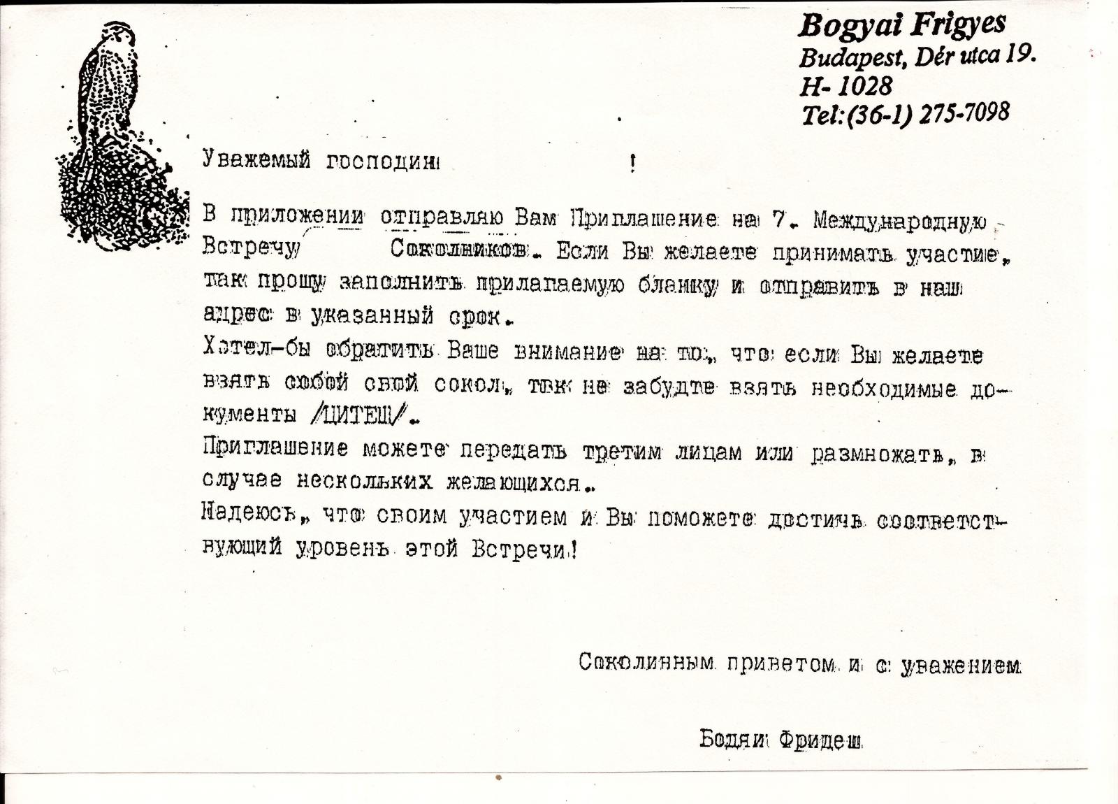 Invitation of ex-Soviet falconers to 7th Int. Falconry Meeting in Hungary at the middle of the 1980'