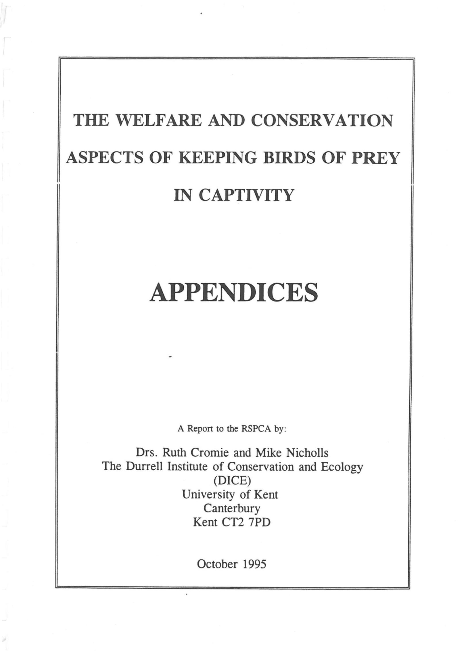 The Welfare and Conservation Aspects of Keeping Birds of Prey in Captivity - Part 1 (Chapters 1-4) - A Report to the RSPCA